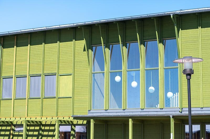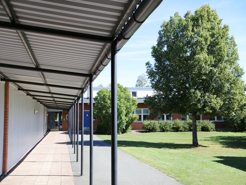 Hela byggnaden har nyligen fått ett nytt energisystem. Många menar att det är precis så här, intill ängarna och skogen som en skola på landet ska ligga. Trivsam skolgård med generösa ytor där underlag av gräs, grus och asfalt inbjuder till olika aktiviteter.