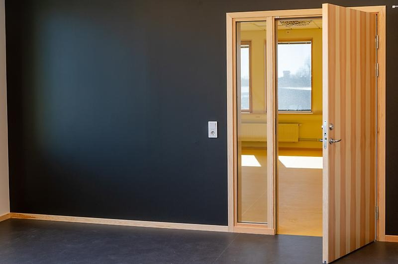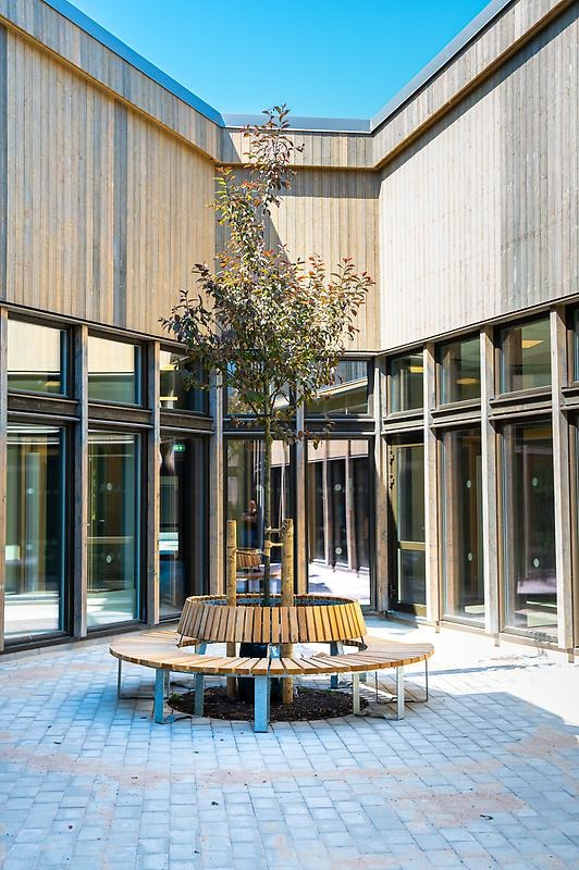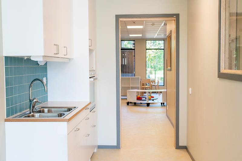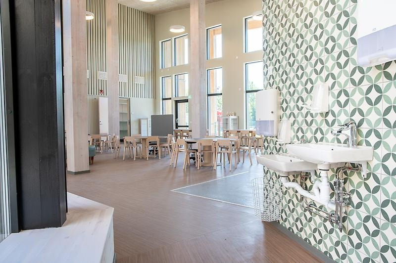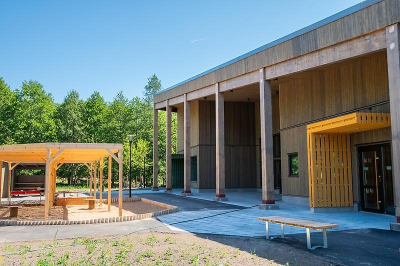 Till förskolan finns en stor uteård intill ett vackert skogsområde, som en gång i tiden var stadens Folkets park. Fasaden har förstås Blåsippans blå nyans.
