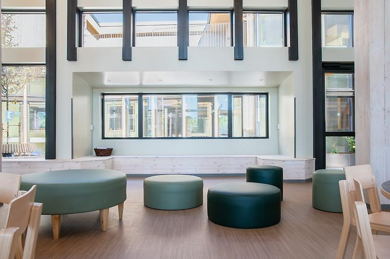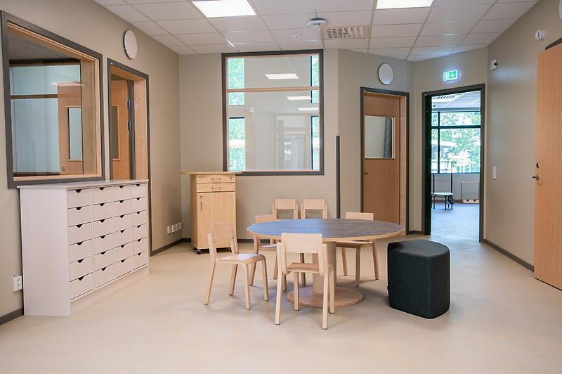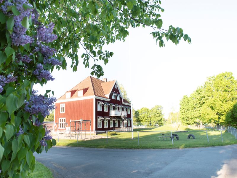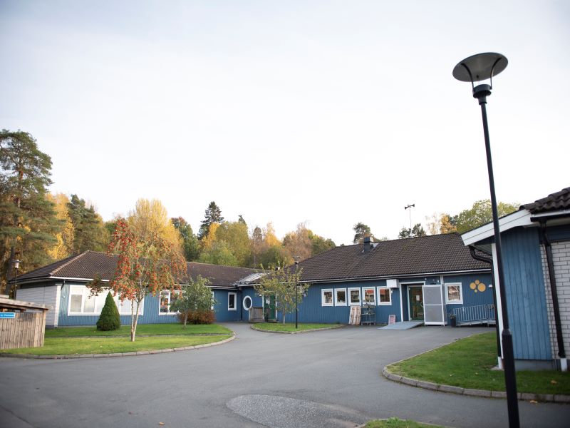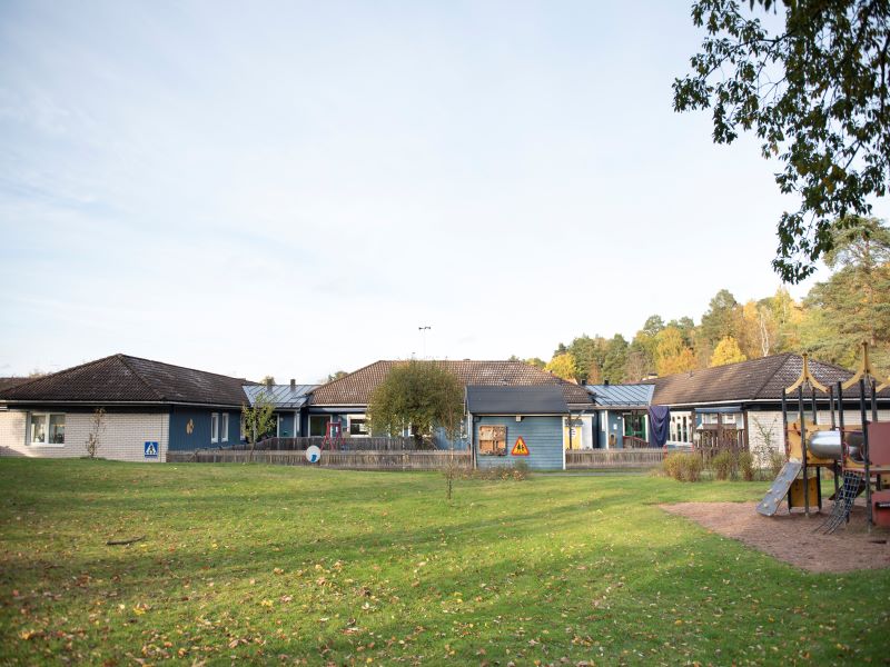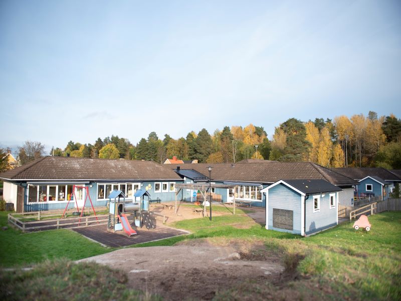 Till förskolan finns en stor uteård intill ett vackert skogsområde, som en gång i tiden var stadens Folkets park. Fasaden har förstås Blåsippans blå nyans.