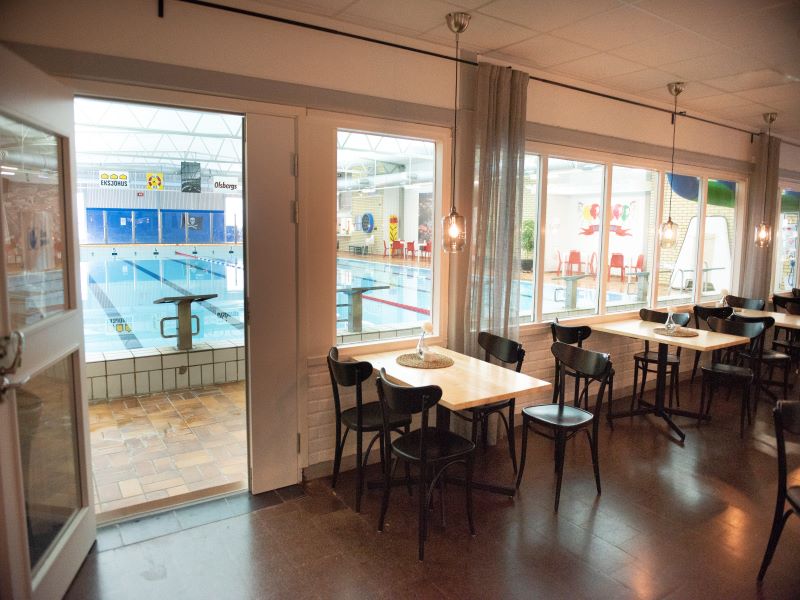 Före detta bostadshus, där väggfasta serverings- och hörnskåp finns bevarade och skapar hemkänsla.